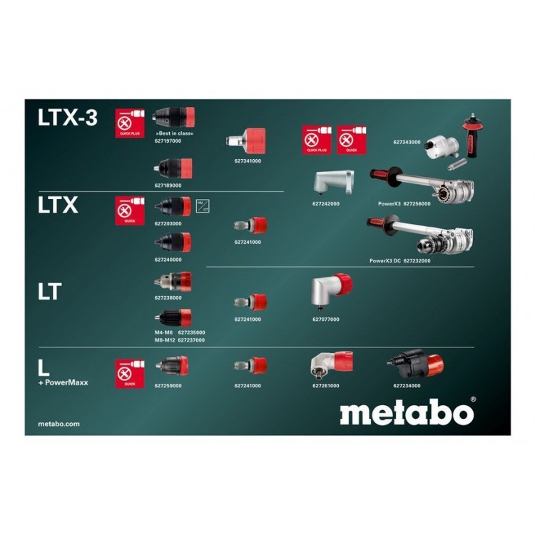 - Система Metabo QuickPlus: швидка заміна патрона, тримача інструментальних насадок, кутового адаптера тощо для швидкої адаптації до інших видів або режимів роботи за максимального навантаження